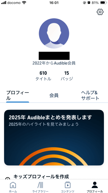 これまでに610タイトル以上をライブラリに追加し、168タイトル以上を聴きました。
